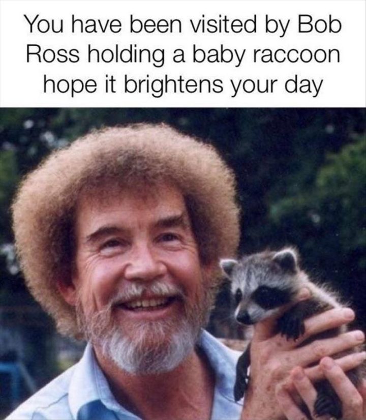 “You have been visited by Bob Ross holding a baby raccoon. Hope it brightens your day.”
