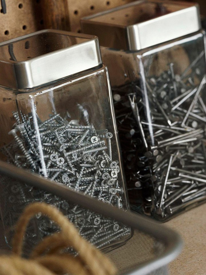 6) Use glass or plastic kitchen canisters to organize screws and nails.