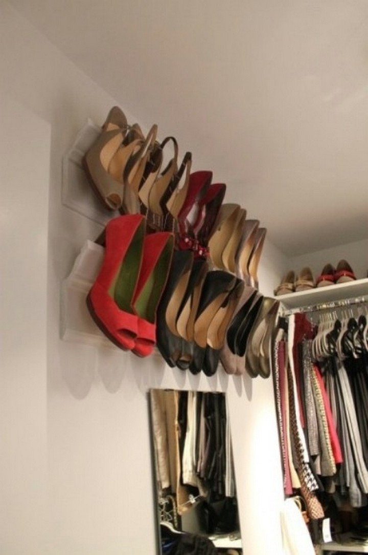Nearly everybody could use more storage ideas when it comes to shoes. Here’s one more! Keep your shoes off the ground and use empty wall space by installing crown moldings to your closet wall.