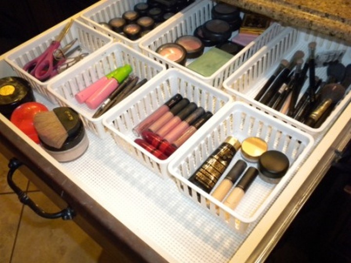 17) Organize your makeup drawer with plastic trays and non-slip drawer liners.