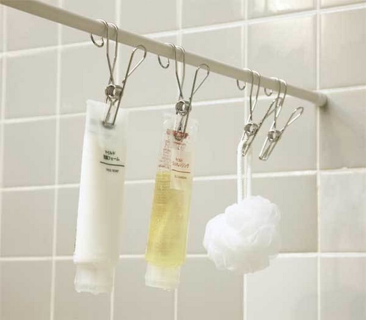 You can use a variety of clips to secure your shampoo, conditioner, or bath sponge.