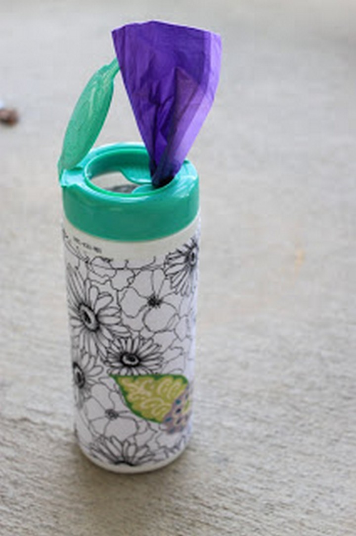 28) Reuse an empty disinfecting wipes container to store any type of plastic bag.