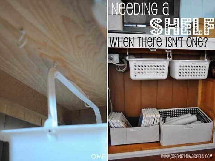 31) Create a hanging shelf using only baskets and cup hanger hooks.