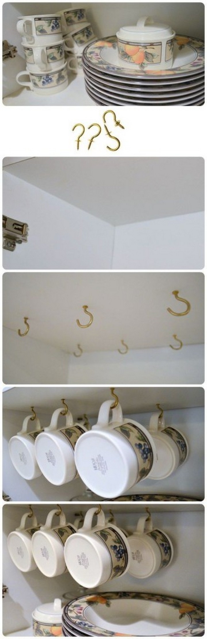 Using cup hooks also prevents teacups or mugs from breaking while stacking them.