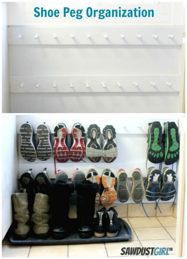 I find myself with a mountain of shoes at the door and this tip is fantastic. Here is a step-by-step tutorial for creating a shoe peg organizer.
