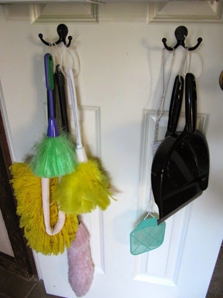 Another great tip is installing hooks to the side walls of your closet to hang things like brooms and mops