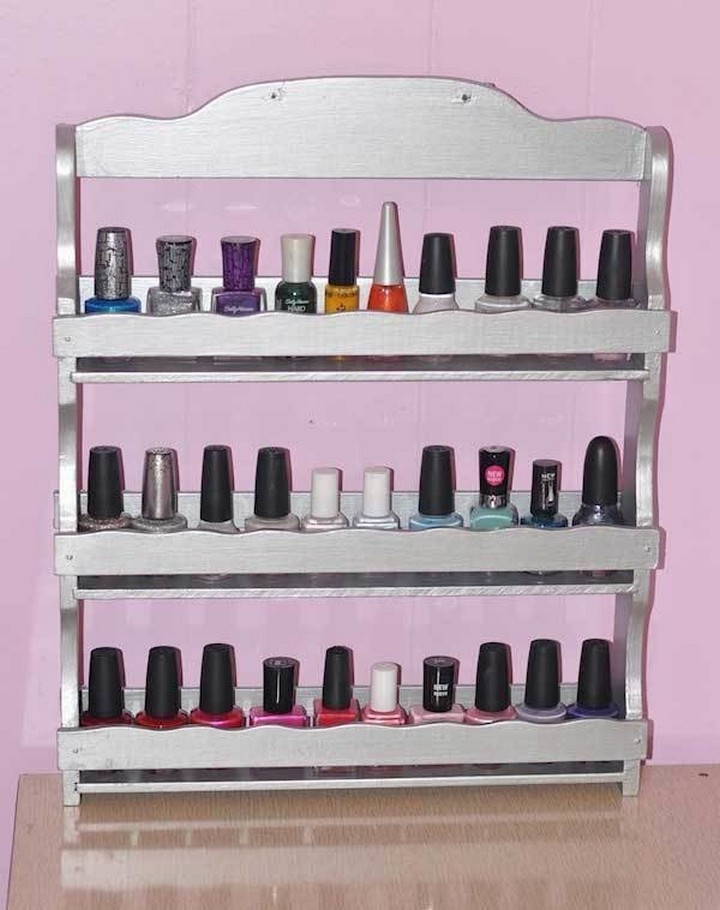 18) Create a jewelry organizer shelf using tacks and a few pieces of wood trim.