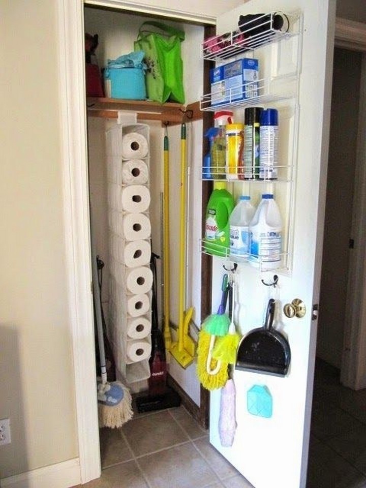 38) Hang an old shoe organizer in the closet to store paper rolls or other cleaning supplies.