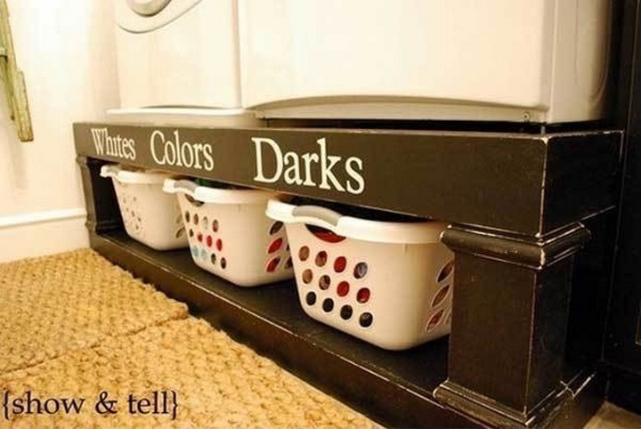 40) Put your washer and dryer on a shelf and store laundry baskets underneath.