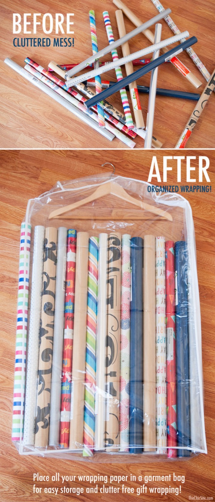Keep your wrapping paper in a garment bag and hang it in your closet.
