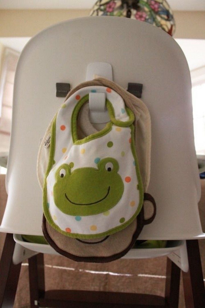 44) Install an adhesive hook behind your baby’s high chair to hang baby bibs or other baby supplies.