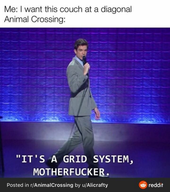 24) “Me: I want this couch at a diagonal. Animal Crossing: It’s a grid system, [censored].”