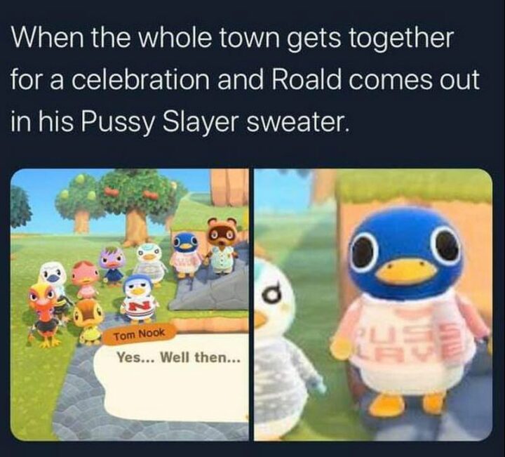 !["When the whole town gets together for a celebration and Roald comes out in his [censored] Slayer sweater. Tom Nook: Yes...Well then..."](https://www.winkgo.com/wp-content/uploads/2022/04/animal-crossing-memes-53-720x651.jpg)