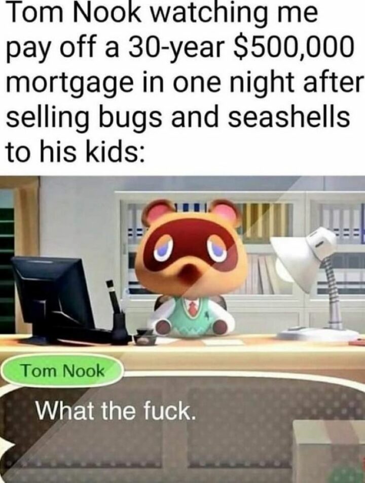 !["Tom Nook watching me pay off a 30-year $500,000 mortgage in one night after selling bugs and seashells to his kids. Tom Nook: What the [censored]."](https://www.winkgo.com/wp-content/uploads/2022/04/animal-crossing-memes-64-720x951.jpg)