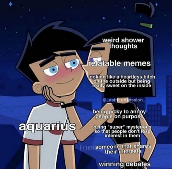 !["Weird shower thoughts. Relatable memes. Looking like a heartless [censored] on the outside but being really sweet on the inside. Being picky to annoy people on purpose. Being super mysterious so that people don't lose interest in them. Someone that shares their interests. Winning debates. Aquarius."](https://www.winkgo.com/wp-content/uploads/2022/02/aquarius-zodiac-memes-41-720x710.jpg)
