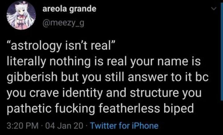 “‘Astrology isn’t real’ literally nothing is real. Your name is gibberish but you still answer to it because you crave identity and structure you pathetic [censored] featherless biped.”