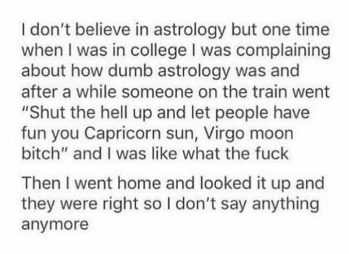 !["I don't believe in astrology but one time when I was in college I was complaining about how dumb astrology was and after a while, someone on the train went 'Shut the hell up and let people have fun you Capricorn sun, Virgo moon [censored]' and I was like what the [censored]? Then I went home and looked it up and they were right so I don't say anything anymore."](https://www.winkgo.com/wp-content/uploads/2023/03/astrology-memes-13-720x523.jpg)