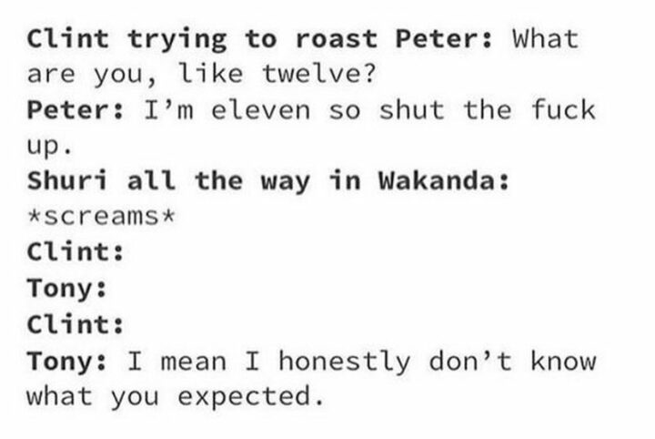 “Clint trying to roast Peter: What are you, like twelve? Peter: I’m eleven so shut the [censored] up. Shuri all the way in Wakanda: *screams*. Clint: Tony: Clint: Tony: I mean I honestly don’t know what you expected.”