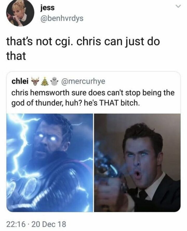 !["That's not CGI. Chris can just do that: Chris Hemsworth sure can't stop being the god of thunder, huh? He's THAT [censored]."](https://www.winkgo.com/wp-content/uploads/2022/07/avengers-memes-13-720x885.jpg)