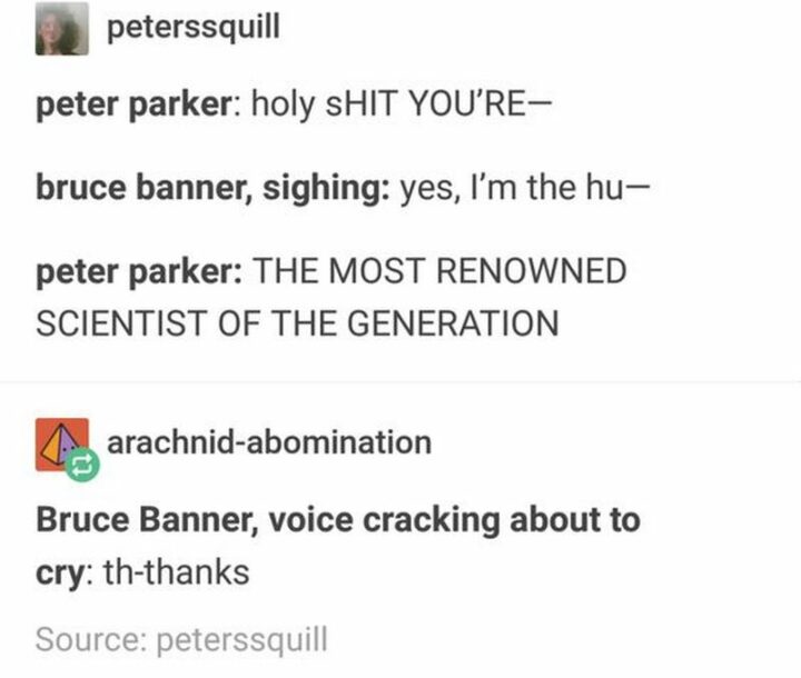 “Peter Parker: Holy [censored] you’re…Bruce Banner, sighing: Yes, I’m the Hu…Peter Parker: The most renowned scientist of the generation. Bruce Banner, voice cracking about to cry: Th-thanks.”