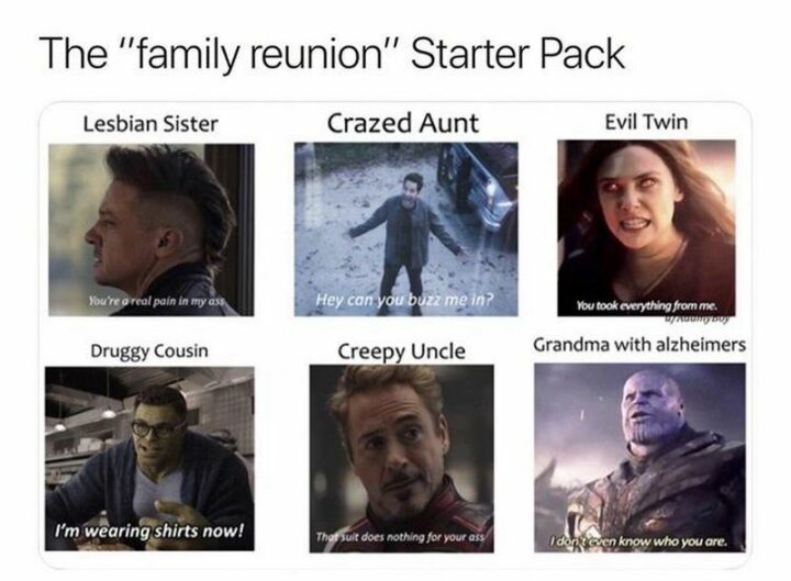 !["The 'Family Reunion' Starter Pack: Lesbian Sister: You're a real pain in my [censored]. Crazed Aunt: Hey can you buzz me in? Evil Twin: You took everything from me. Druggy Cousin: I'm wearing shirts now! Creepy Uncle: That suit does nothing for your [censored]. Grandma with Alzheimer's: I don't even know who you are."](https://www.winkgo.com/wp-content/uploads/2022/07/avengers-memes-18-720x529.jpg)