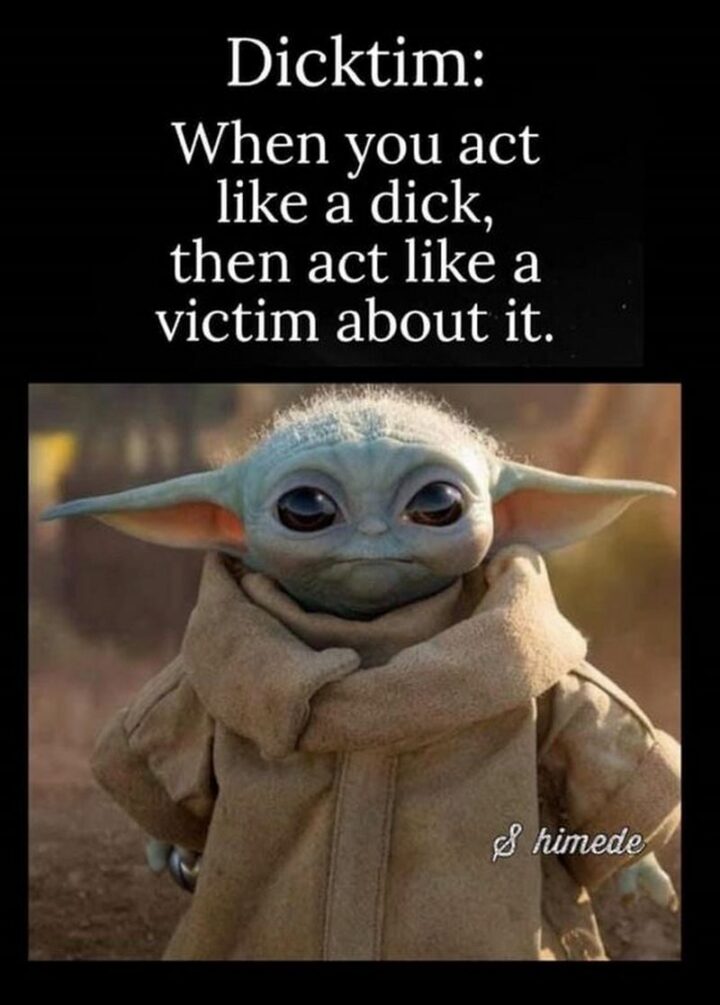 ![35 Baby Yoda (Grogu) Memes - "Dicktim: When you act like a [censored], then act like a victim about it."](https://www.winkgo.com/wp-content/uploads/2022/09/baby-yoda-grogu-memes-04-720x1005.jpg)