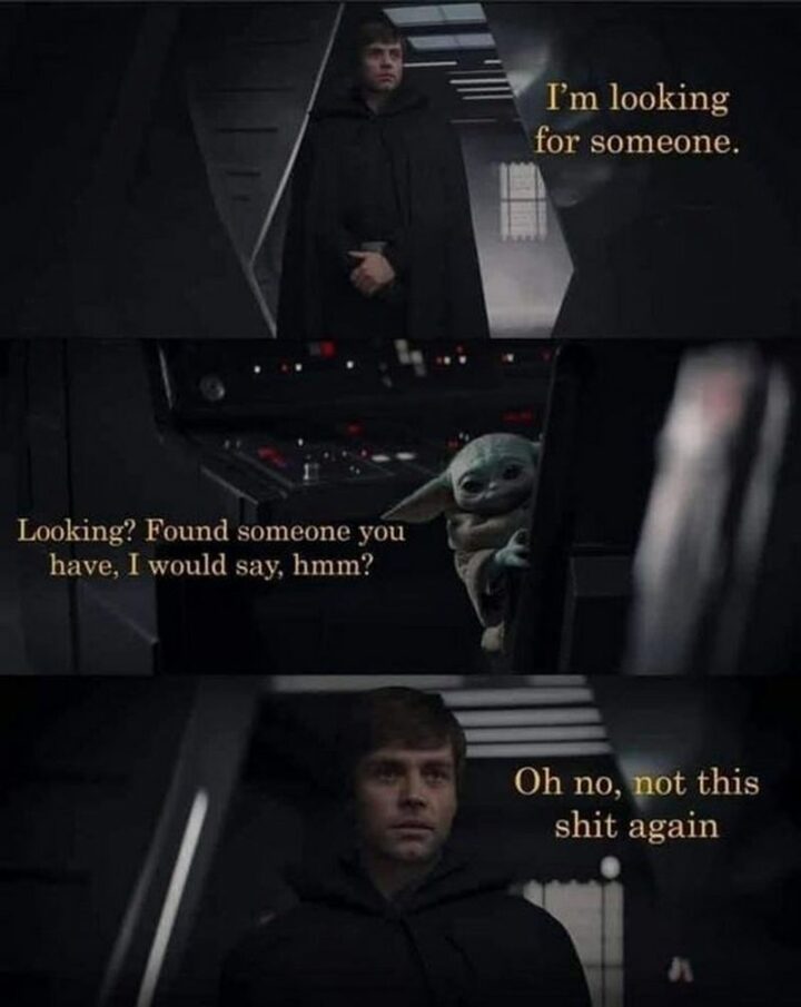 !["I'm looking for someone. Looking? Found someone you have, I would say, hmm? Oh no, not this [censored] again."](https://www.winkgo.com/wp-content/uploads/2022/09/baby-yoda-grogu-memes-19-720x905.jpg)