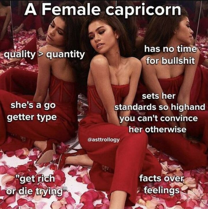 !["A female Capricorn: Quality > quantity. Has no time for [censored]. She's a go-getter type. Sets her standards so high and you can't convince her otherwise. Get rich or die trying. Facts over feelings.](https://www.winkgo.com/wp-content/uploads/2022/02/capricorn-zodiac-memes-01-720x724.jpg)