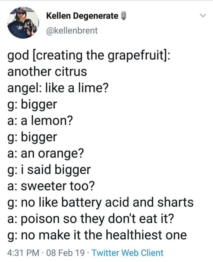 “God [creating the grapefruit]: Another citrus. Angel: Like a lime? God: Bigger. Angel: A lemon? God: Bigger. Angel: An orange? God: I said bigger. Angel: Sweeter too? God: No, like battery acid and sharts. Angel: Poison so they don’t eat it? God: No, make it the healthiest one.”