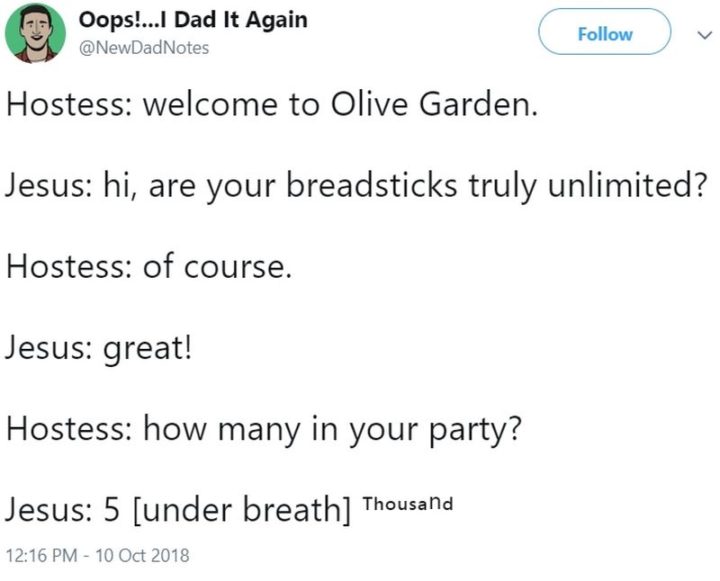 “Hostess: Welcome to Olive Garden. Jesus: Hi, are your breadsticks truly unlimited? Hostess: Of course. Jesus: great! Hostess: How many in your party? Jesus: 5 [under breath] thousand.”