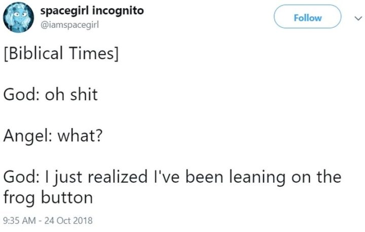 “[Biblical times] God: Oh crap. Angel: What? God: I just realized I’ve been leaning on the frog button.”