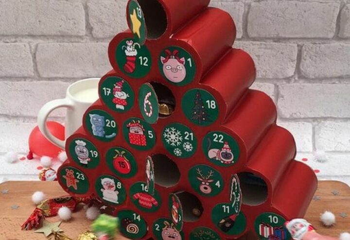 To make your own DIY calendar, you’ll need 24 cardboard tubes, wrapping paper, and Christmas candy.