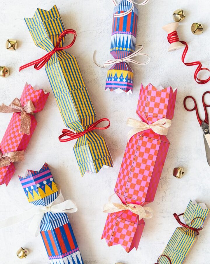 To make your own Christmas poppers, you will only need colorful kraft paper, ribbon, glue, and the template available on their website for a small fee.