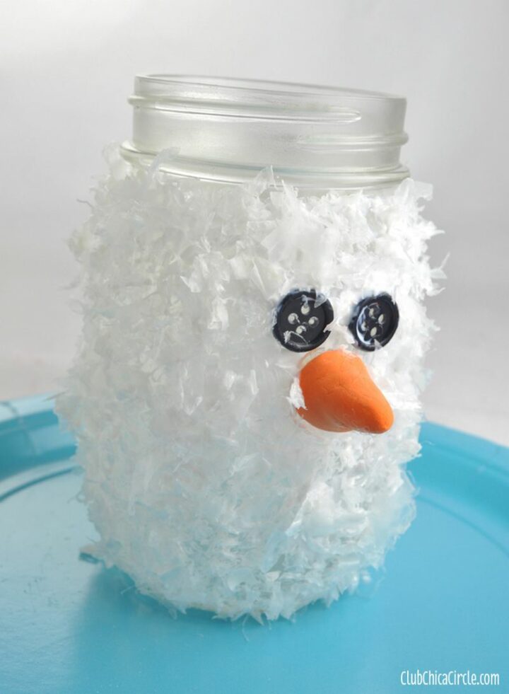It’s easy to make and it only requires a mason jar, decoupage glue, googly eyes, artificial snowflakes, and some other craft supplies.