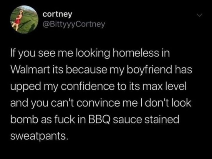 “If you see me looking homeless in Walmart it’s because my boyfriend has upped my confidence to its max level and you can’t convince me I don’t look bomb as [censored] in BBQ sauce stained sweatpants.”