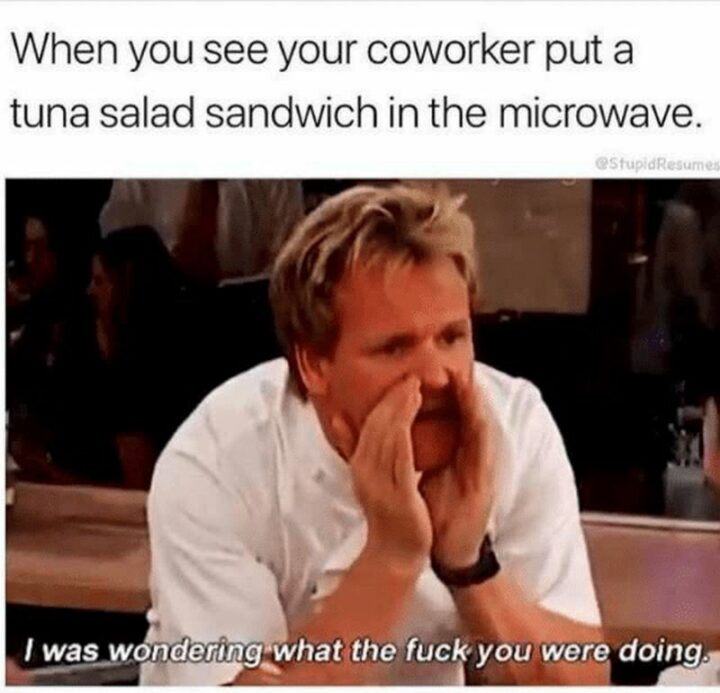 !["When you see your annoying coworker put a tuna salad sandwich in the microwave: I was wondering what the [censored] you were doing."](https://www.winkgo.com/wp-content/uploads/2022/03/coworker-memes-40-720x693.jpg)