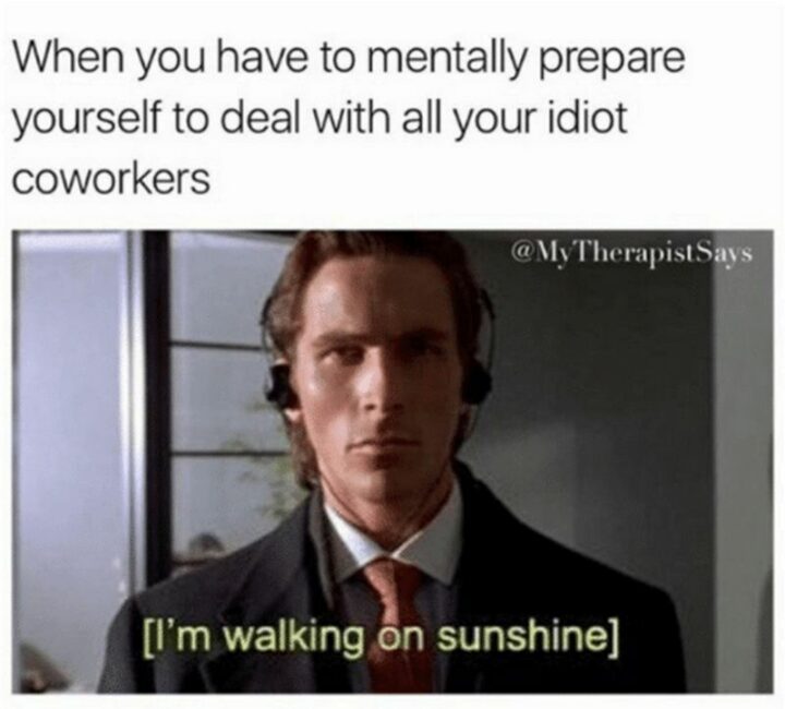 !["When you have to mentally prepare yourself to deal with all your idiot coworkers or work friends: [I'm walking on sunshine]."](https://www.winkgo.com/wp-content/uploads/2022/03/coworker-memes-62-720x650.jpg)