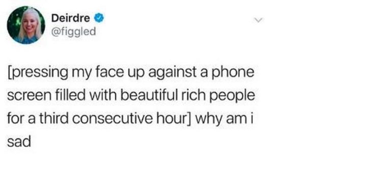 “[pressing my face up against a phone screen filled with beautiful rich people for a third consecutive hour] Why am I sad.”