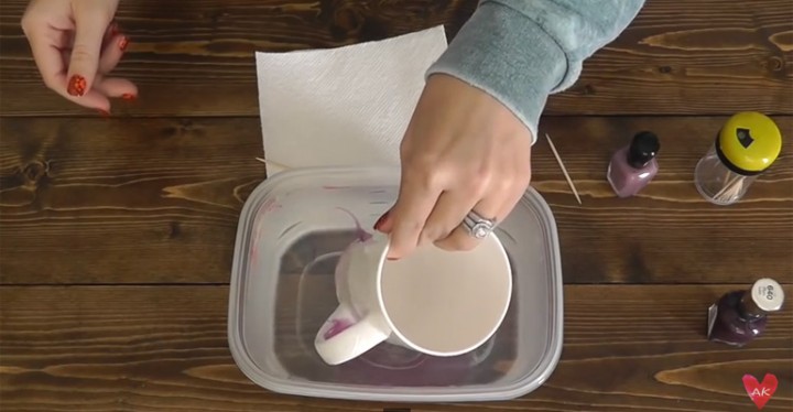 The process itself is surprisingly straightforward. First, you’ll need to fill a container with warm water. Then, simply add a few drops of nail polish onto the surface of the water, allowing the colors to spread and blend naturally. Once you’re satisfied with the pattern created, you can gently dip the coffee mug into the water, allowing the nail polish to adhere to its surface. After a quick drying period, you’ll have a stunning watercolor effect on your mug that is both eye-catching and unique.