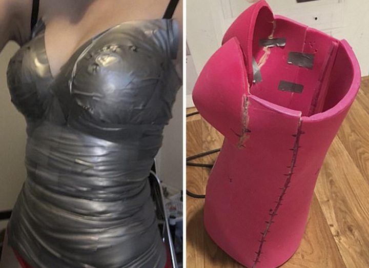 She started by duct taping herself to create a form or mold for the costume and ensure it is a perfect fit.