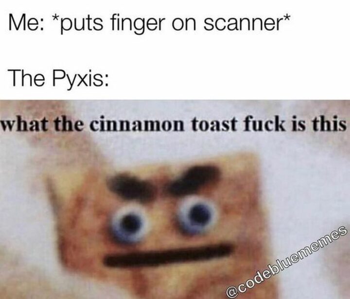 “Me: *puts finger on scanner* The Pyxis: What the cinnamon toast [censored] is this?”