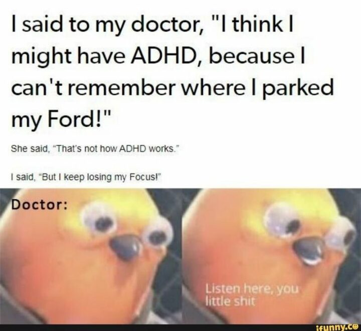 !["I said to my doctor, 'I think I might have ADHD because I can't remember where I parked my Ford! She said, 'That's not how ADHD works. I said, 'But I keep losing my Focus! Doctor: Listen here, you little [censored]."](https://www.winkgo.com/wp-content/uploads/2023/03/doctor-memes-22-720x661.jpg)