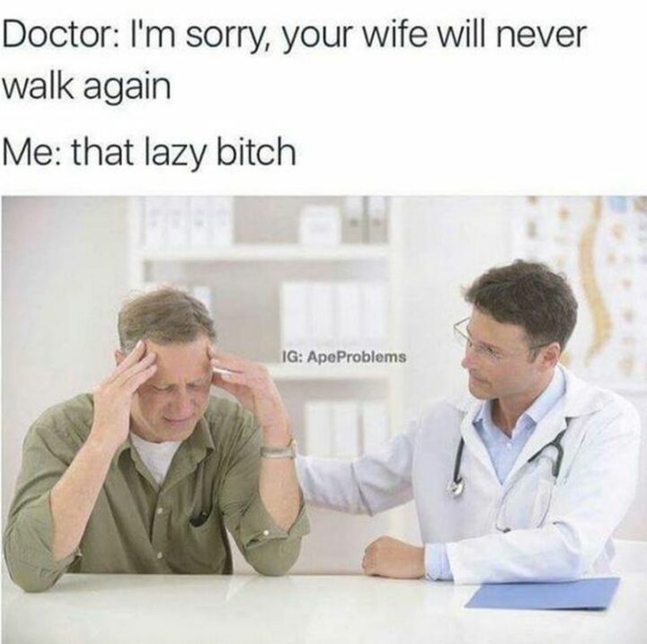 !["Doctor: I'm sorry, your wife will never walk again. Me: That lazy [censored]."](https://www.winkgo.com/wp-content/uploads/2023/03/doctor-memes-23-720x717.jpg)