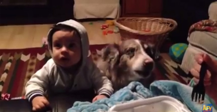 Parents love to see their babies learn to crawl, take their first steps, and hear their first words and every step along the way brings joy. When this family tries to get their baby to say the words ‘mama’ by enticing him with food, the family dog wants to enter this competition!
