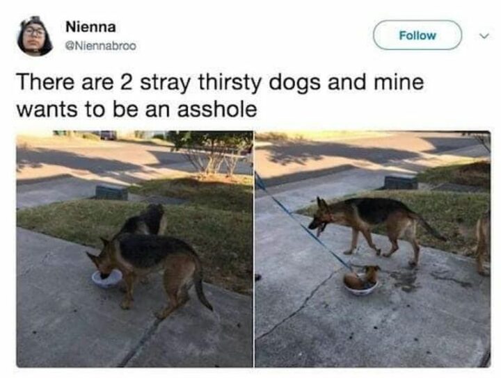"There are 2 stray thirsty dogs and mine wants to be an [censored]."