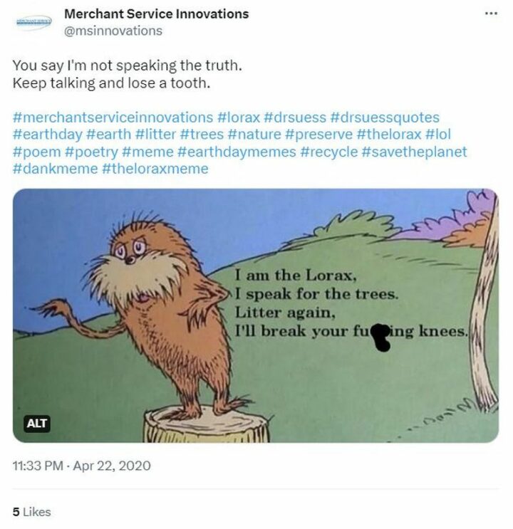 !["I am the Lorax, I speak for the trees. Litter again, I'll break your [censored] knees. You say I'm not speaking the truth. Keep talking and lose a tooth.](https://www.winkgo.com/wp-content/uploads/2023/04/earth-day-memes-37-720x743.jpg)