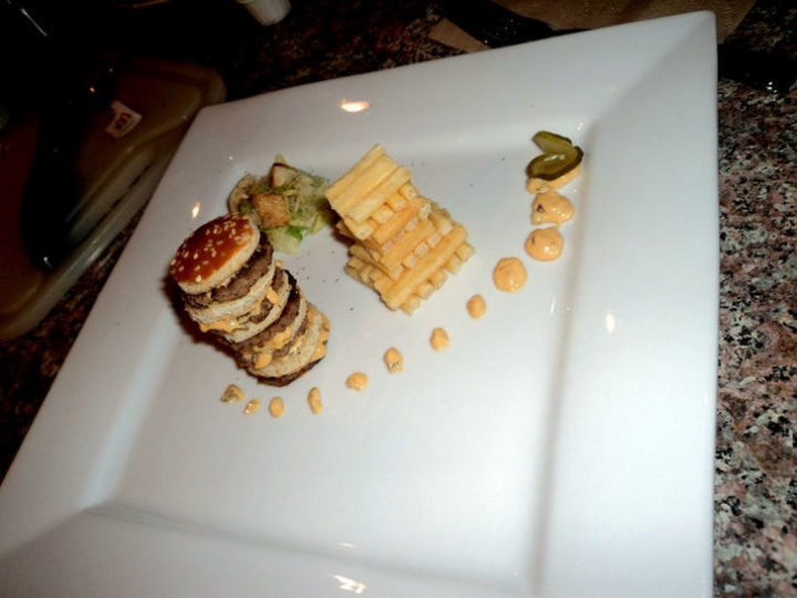 The first entry is done. A 5 times cheeseburger (triple cheeseburgers are for wimps…5 patties rule), a potato tower, salad with sesame seed bun croutons and an elegant dribble of mac sauce.