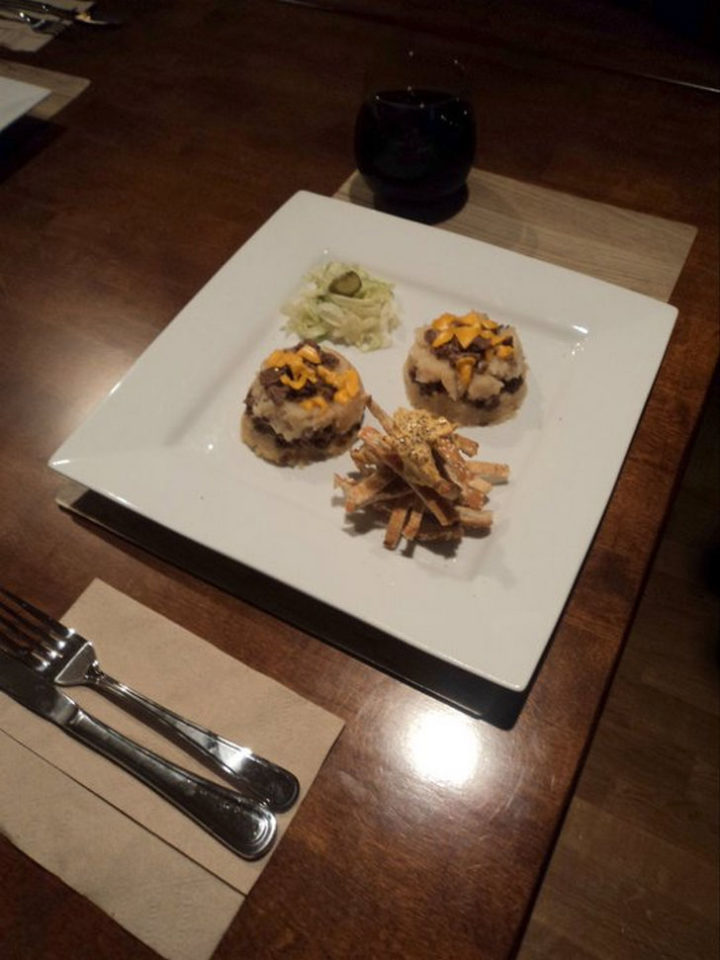 His friend has completed his entry: Big Mac mini Shepherd’s Pies with sesame seed crisps and a salad.