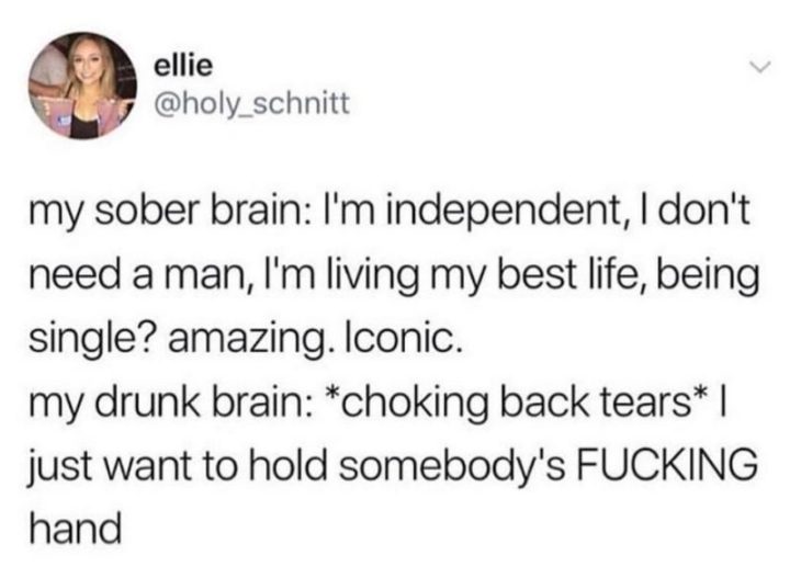 “My sober brain: I’m independent, I don’t need a man, I’m living my best life, being single? Amazing. Iconic. My drunk brain: *choking back tears* I just want to hold somebody’s [censored] hand.”