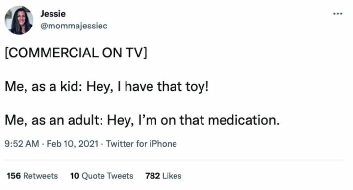 4) “[commercial on TV] Me, as a kid: Hey, I have that toy! Me, as an adult: Hey, I’m on that medication.”